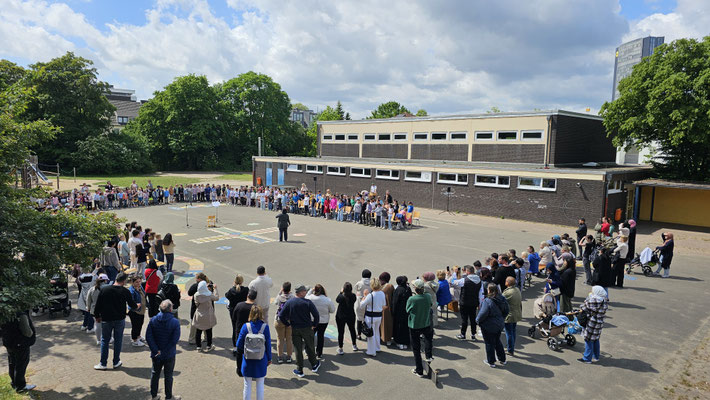 Wir Viertklässler ziehen davon, wie unsere Luftballons vom Abschlussfest, aber unsere Hände und Namen bleiben hier.